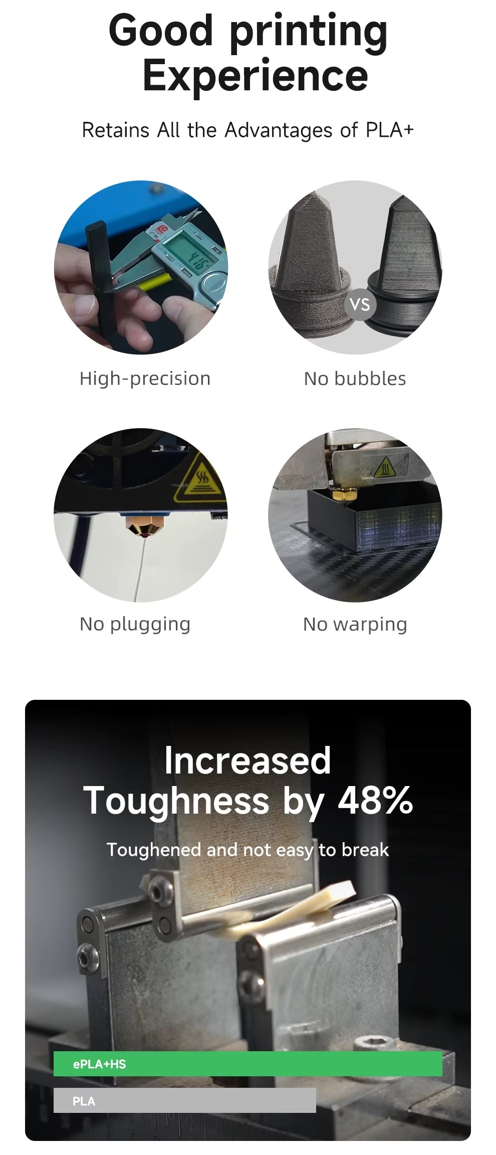 PLA+HS, yüksek hızda baskıya özel formüle edilmiştir; daha iyi eriyebilirlik ve katman yapışması sunar.