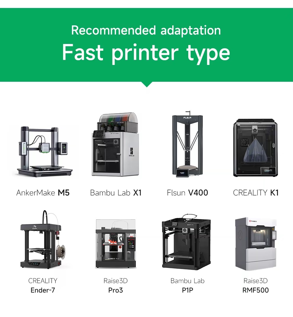 Yüksek hızlı 3D yazıcılar (Bambu Lab, Creality K-Serisi, Anycubic Kobra 2 vb.) ile tam uyumludur.