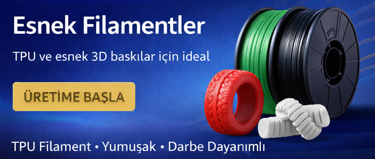 Esnek filamentler, 3D baskıda bükülebilirlik, darbe dayanımı ve lastik benzeri yapı gerektiren uygulamalar için geliştirilen özel filament grubudur. TPU başta olmak üzere flexible yapıdaki filamentler, standart sert filamentlere göre çok daha esnek sonuçlar sunar. Bu sayede titreşim emici parçalar, koruyucu ürünler, conta benzeri baskılar, esnek bağlantı elemanları, telefon kılıfları ve yumuşak yapılı fonksiyonel parçalar üretmek için ideal bir seçenek haline gelir.